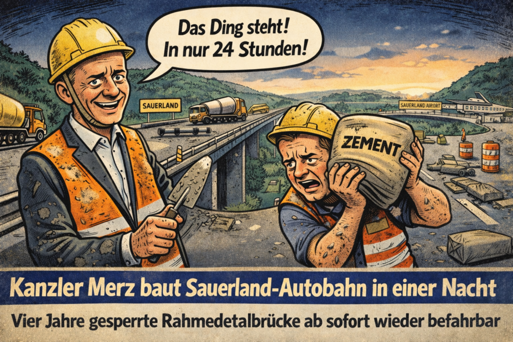 Friedrich Merz baut in einer Nacht Berlin/Sauerland – Bundeskanzler Friedrich Merz hat sich am Morgen zufrieden über die Fertigstellung der Sauerland-Autobahn gezeigt. Das Großprojekt sei, so Merz, „in rekordverdächtiger Zeit“ abgeschlossen worden. Ursprünglich war von einer Bauzeit von vier Jahren die Rede. Ein kurzer Faktencheck ergab jedoch: Friedrich Merz ist erst seit rund acht Monaten…