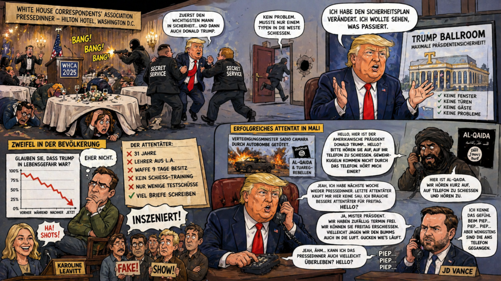 Trump will zeitnah Al-Kaida um Attentat bitten. Trump hat es nicht leicht. Gerade ein schweres Attentat überstanden und danach will ihm niemand glauben, dass er ein schweres Attentat überstanden hat. In der Nacht vom 25. auf den 26. April im Hilton Hotel in Washington D.C., nahm an einer Korrespondenten Gala der White House Correspondents‘ Association…